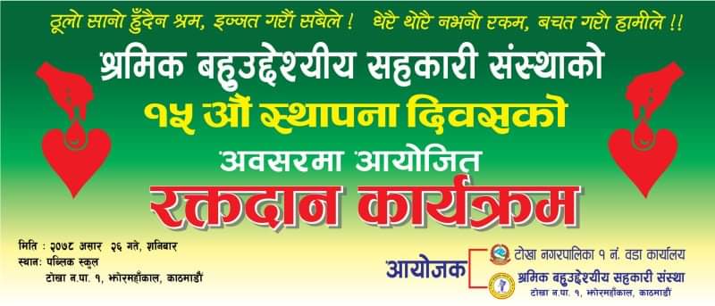 तारकेश्वर असार २५ टोखा नगरपालिका वडा न १ झोर को पब्लिक स्कुलमा रक्तदान कार्यक्रम सम्पन्न भएको छ। श्रमिक बहुउद्देश्यीय सहकारीको सस्थाको १५ अौ स्थापना दिवसको अवसर मा टोखा नगरपालिका वडा न १ र श्रमिक बहुउद्देश्यीय सहकारी सस्थाको सयुक्त आयोजनामा भएको हो । रक्तदान कार्यक्रममा २६ जनाले रक्तदान गरेको । श्रमिक सहकारी सस्थाका अध्यक्ष लक्ष्मण विडारीले तारकेश्वर अनलाइन लाई जानकारी दिए । रक्तदान कार्यक्रम ११ बजे देखि ३ बजे सम्म चलेको थियो ।