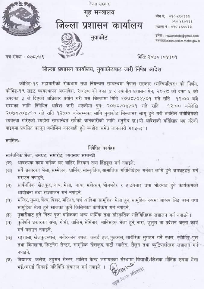 नुवाकोट, १ साउन । नुवाकोटमा जारी निषेधाज्ञालाई केही खुकुलो बनाउँदै थप गरिएको छ । जिल्ला कोभिड संकट व्यवस्थापन समिति र जिल्ला प्रशासन कार्यालय नुवाकोटको संयुक्त बैठकले आज राति १२ बजेदेखि जिल्लाभर लागुहुने गरी जारी निषेधाज्ञा थपगरिएको हो।