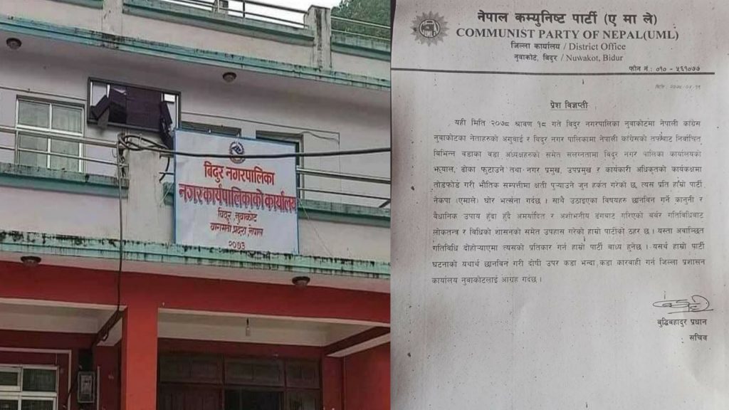 विदुर नगरपालिका ताेडफाेडमा संलग्नलाई कारवाहि गर्न नुवाकाेट एमालेकाे माग
