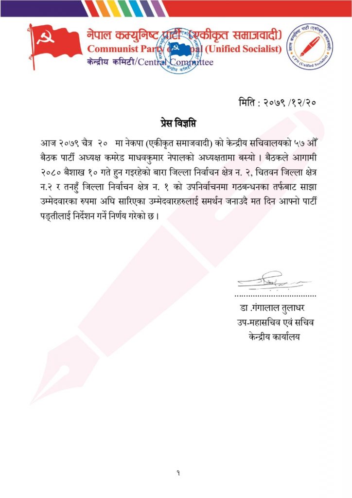पार्टी अध्यक्ष माधवकुमार नेपालको अध्यक्षतामा बसेको बैठकले बाराको निर्वाचन क्षेत्र नं . २ चितवन निर्वाचन क्षेत्र नं. २ र तनहुँको निर्वाचन क्षेत्र नं. १ को उपनिर्वाचनमा गठबन्धनका तर्फबाट साझा उम्मेदवारका रुपमा अघि सारिएका उम्मेदवारहरूलाई समर्थन जनाउँदै मत दिन आफ्नो पार्टी पङ्क्तिलाई निर्देशन गर्ने निणय भएको बैठक पछि पार्टीका उपमहासचिव तथा कार्यालय सचिव डा. गंगालाल तुलाधरद्वारा जारी प्रेस विज्ञप्तिमा उल्लेख छ ।